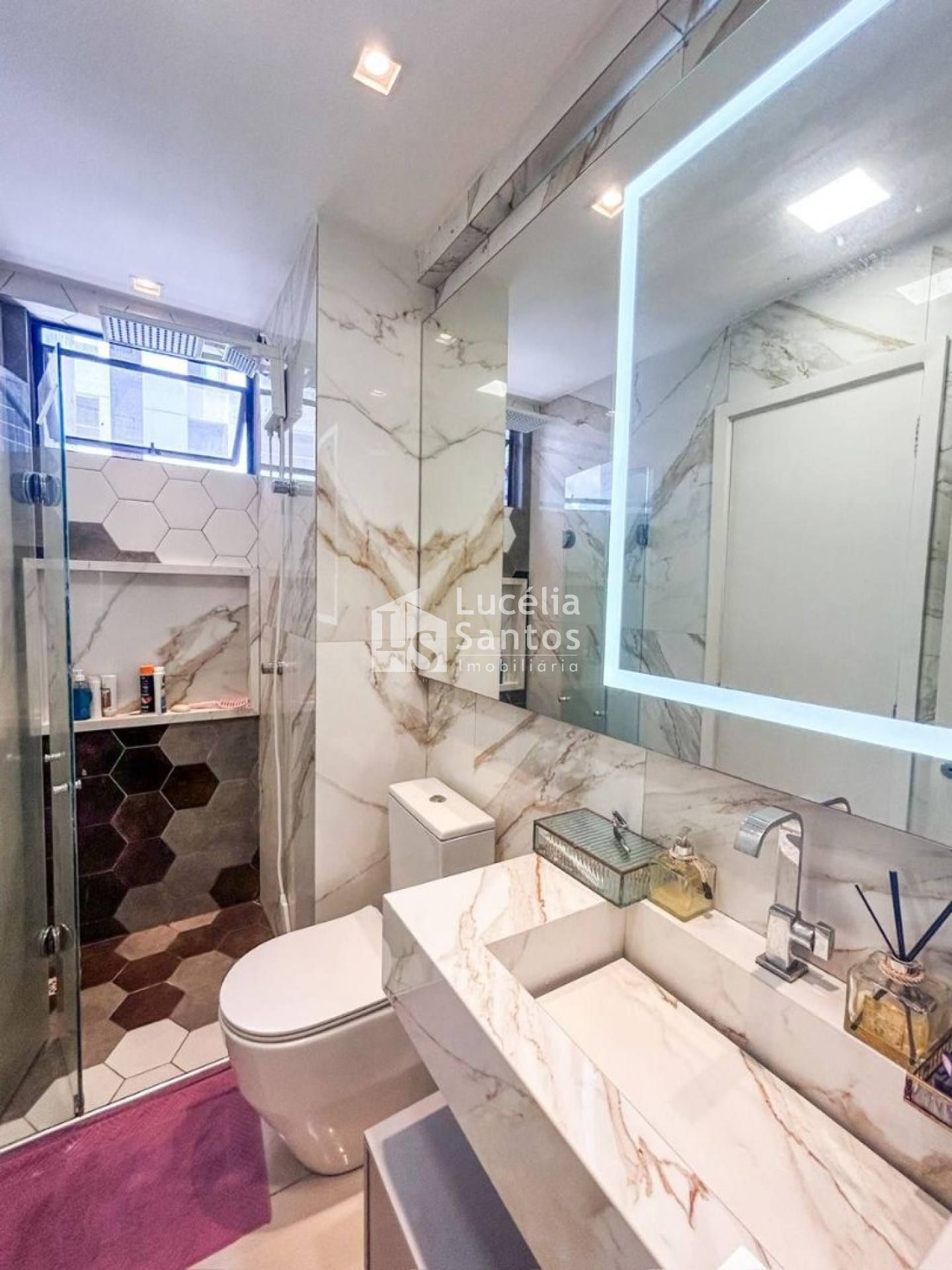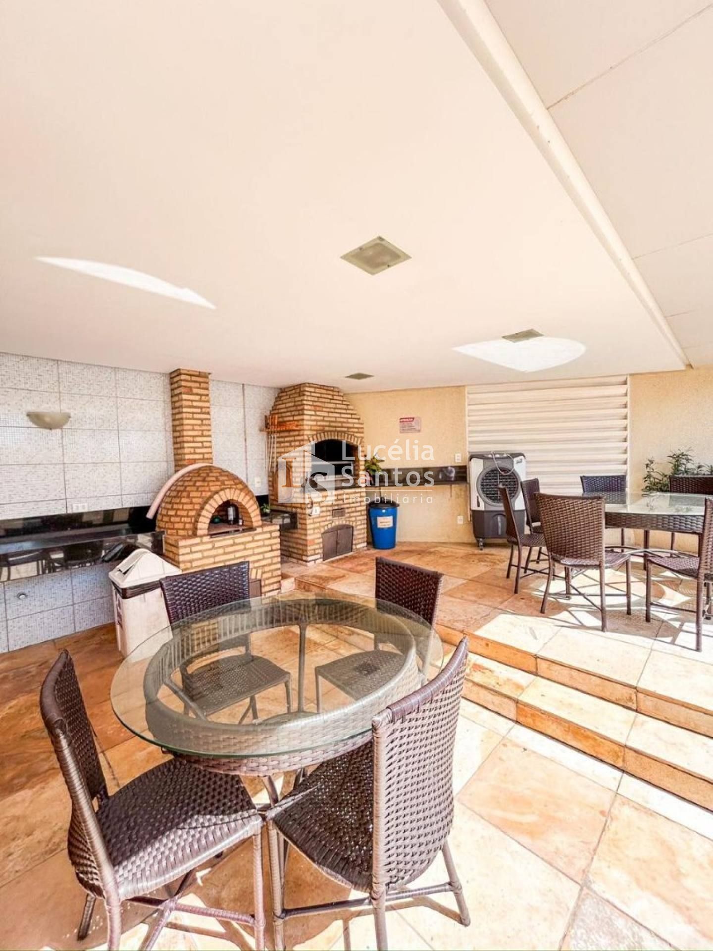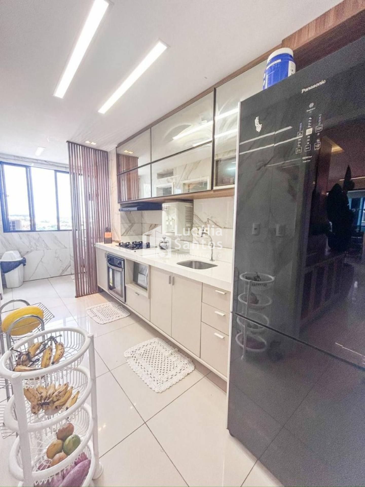 Apartamento de 107 m² com sala de estar/jantar, varanda gourmet com churrasqueira e proteção de tela, 03 suítes (sendo uma suíte com sacada e a outra reversível), 01 banheiro social, cozinha e área de serviço.