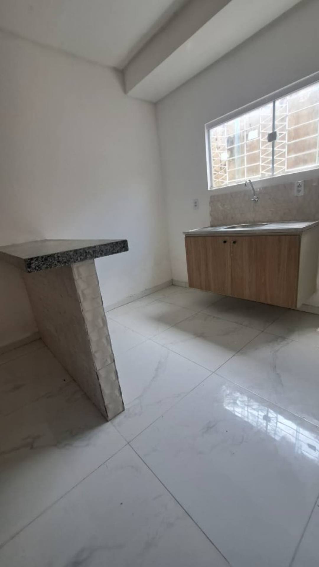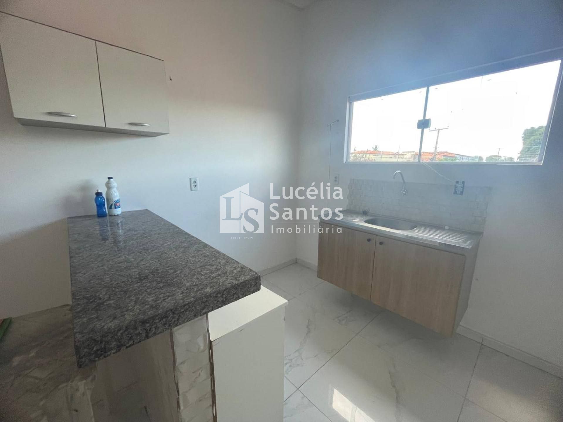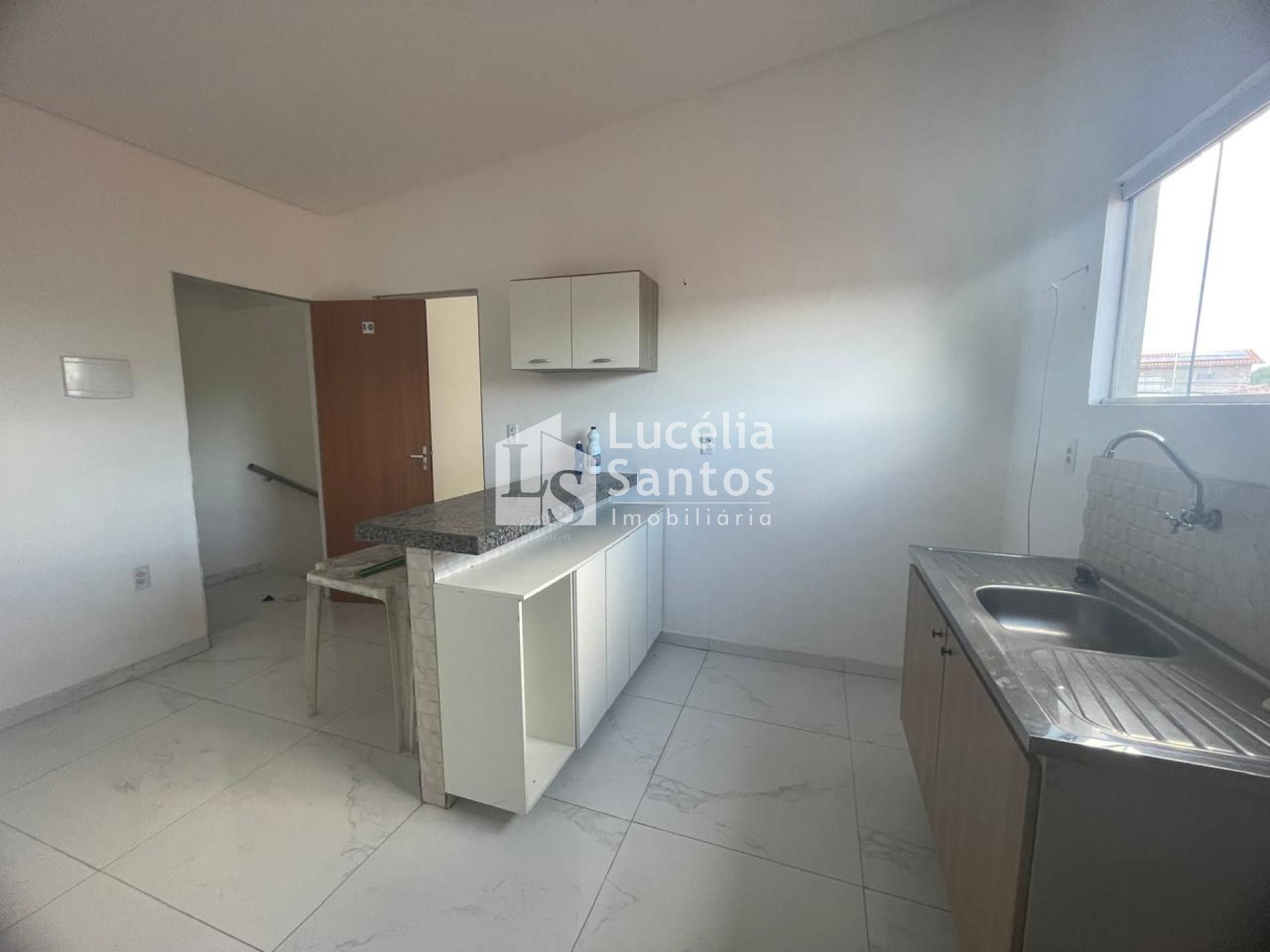 Kitnet no pavimento superior, com 02 quartos, sendo 01 com sacada, sala de estar, cozinha com balcão em granito, pia com armário, área de serviço, banheiro social.