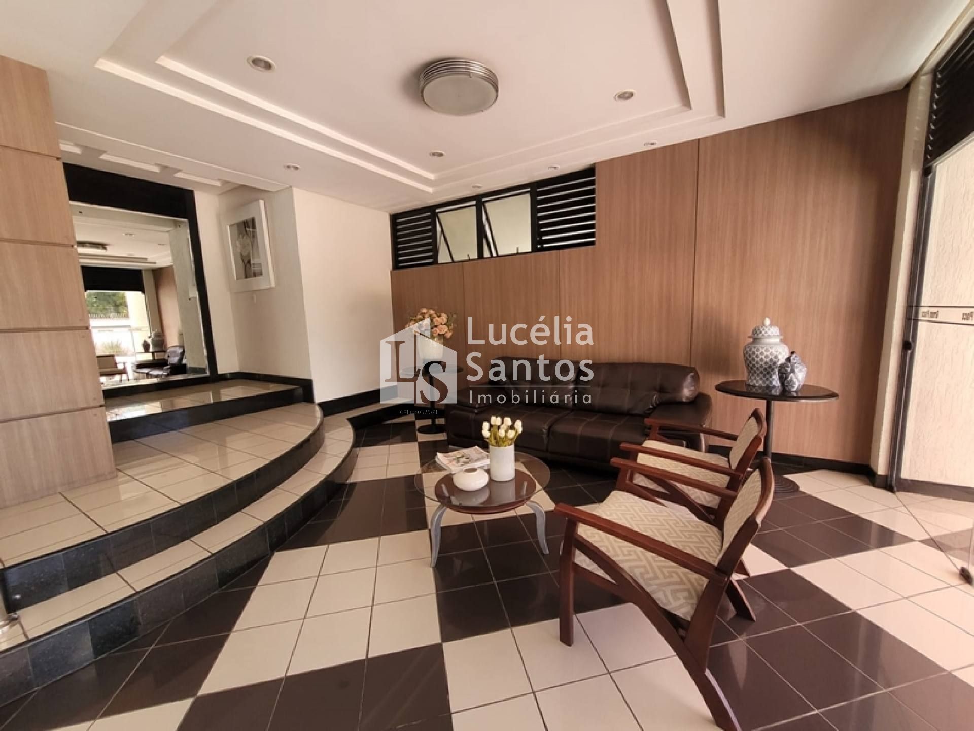 Edifício de uma torre com dois apartamentos por andar, recepção decorada, elevadores e muito mais.